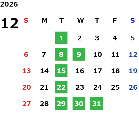 12/30(火)~1/6(火)を休業日とさせていただきます。